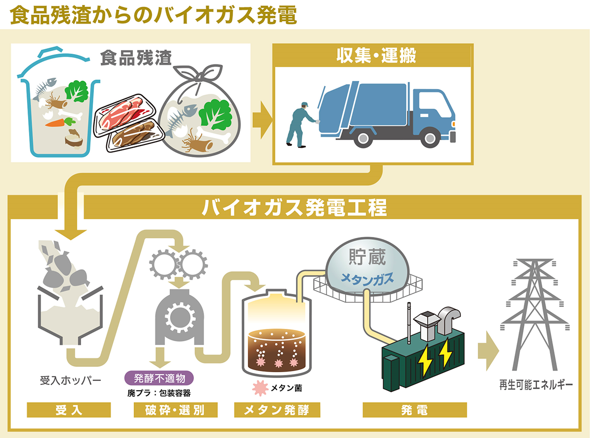 今まで焼却していた食品残渣等から「メタンガス」を発生させ、電気(再生エネルギー)に生まれ変わらせます。