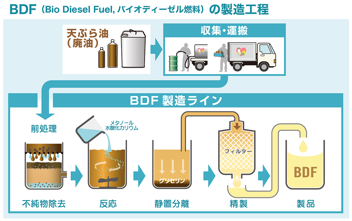 廃棄された使用済みの植物油から製造されているため、CO2排出量は0カウント!カーボンニュートラルな燃料です。