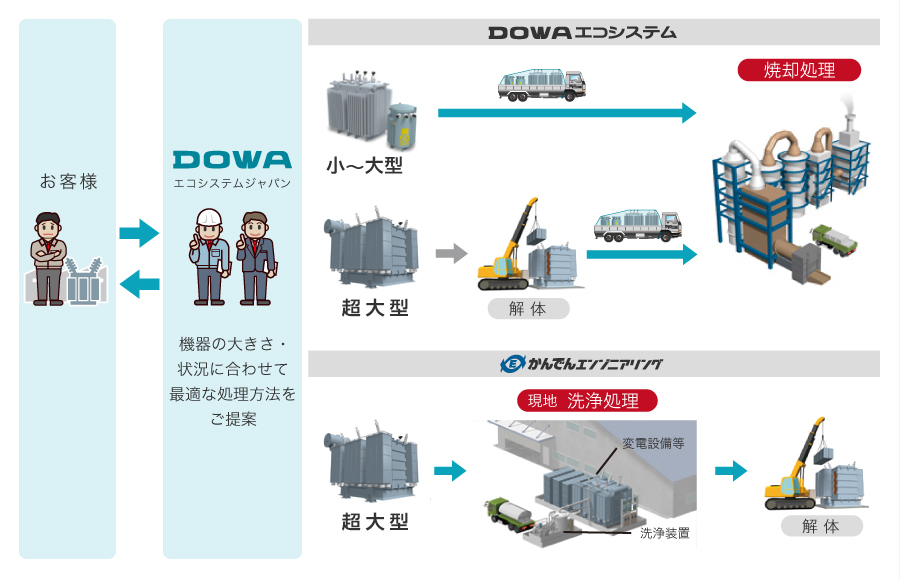 拠点の工場・2拠点の積替え保管施設を有しており、全国のPCB廃棄物に対応できます。