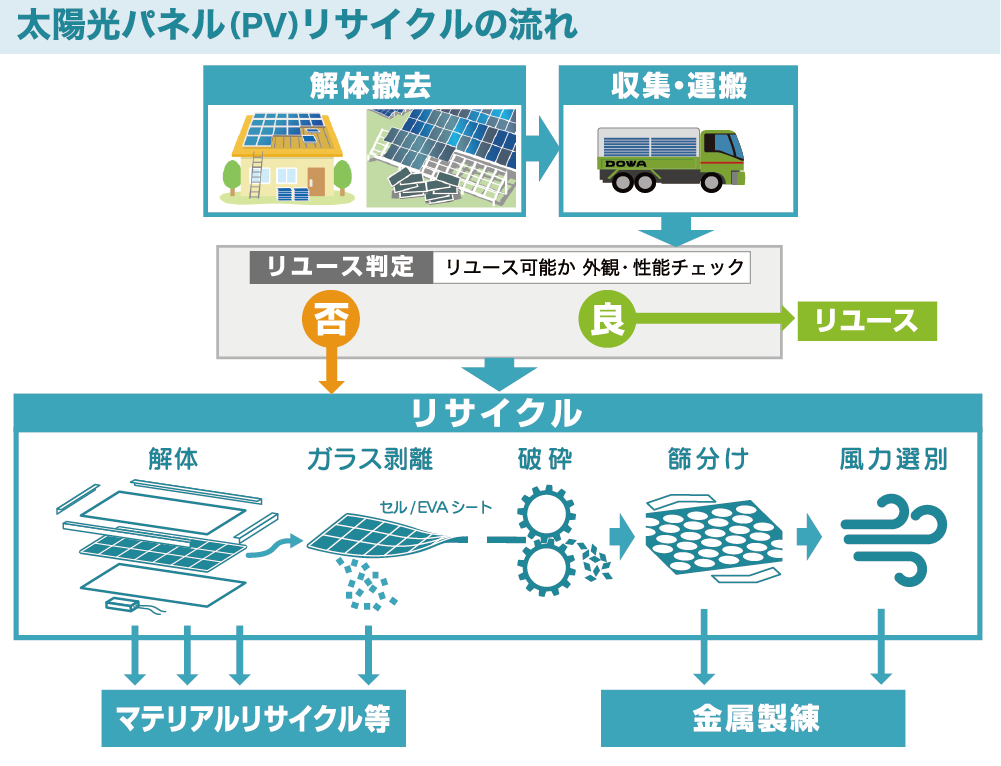DOWAは、使用済PVのリユース、リサイクル(金属、熱回収)に取り組んでいます。